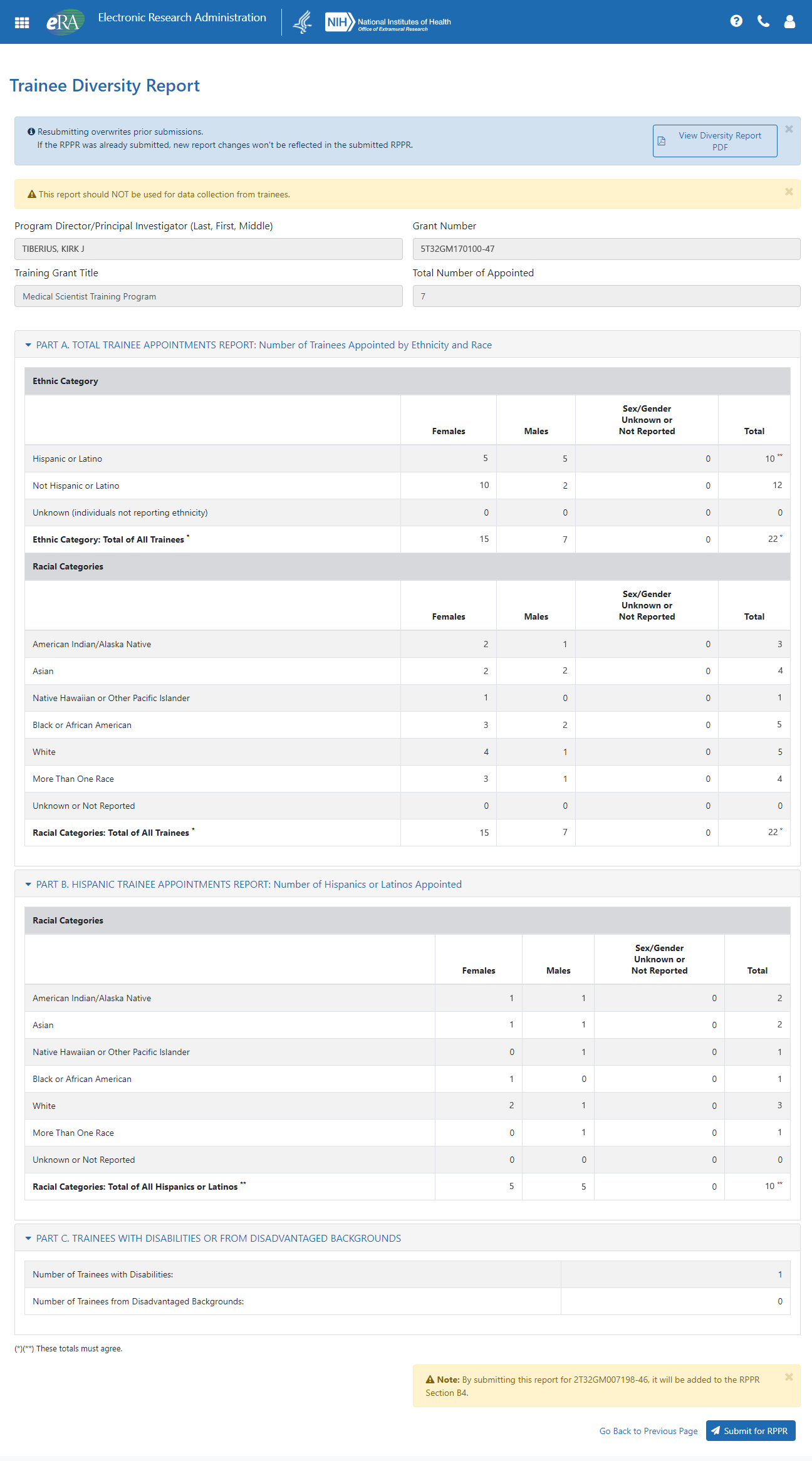 Submitting a Trainee Diversity Report with the Research Performance Progress Report (RPPR) has long been required by NIH for institutional training and career development awards and most research education grants. For recipient organizations, this report previously has involved manually collecting the demographic information from trainees for the report. To reduce the burden on recipients, eRA has developed a streamlined Trainee Diversity Report that collects existing demographic information entered by trainees and other appointees in the Personal Profile of eRA Commons during the appointment process and thus minimizes the need for manual data entry by recipients.