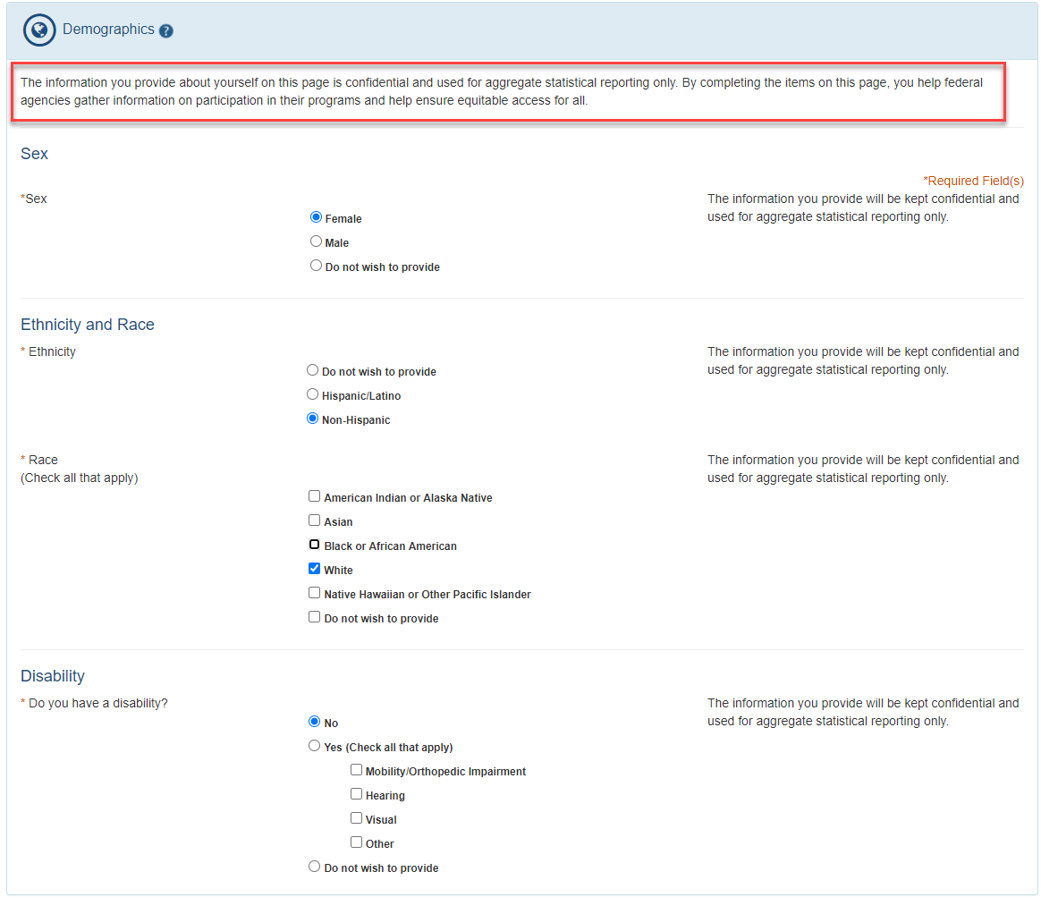 Figure 2: The Demographics section of the Personal Profile. Note that data is confidential and used for aggregate statistical reporting only