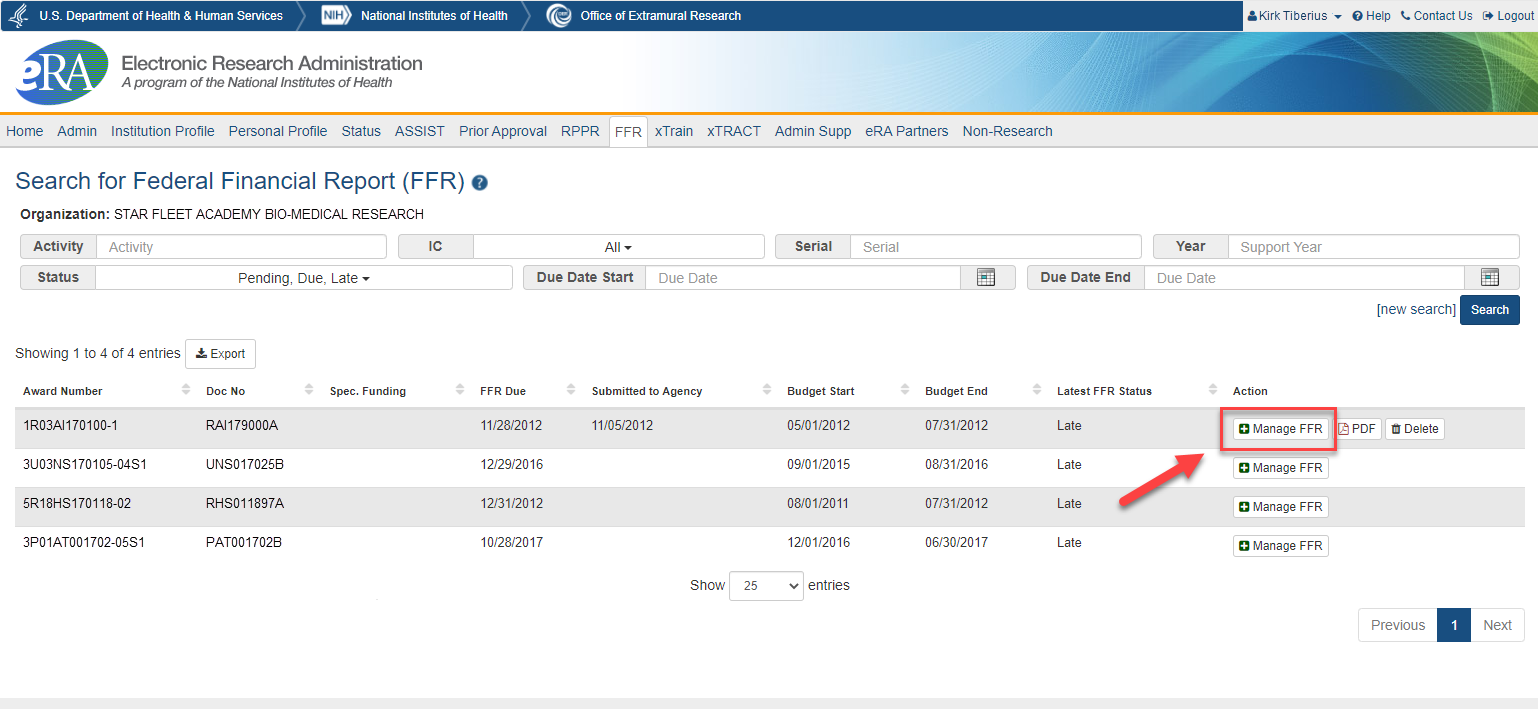 Figure 1: The Manage FFR button in eRA Commons/FFR that will take the user to the Payment Management System
